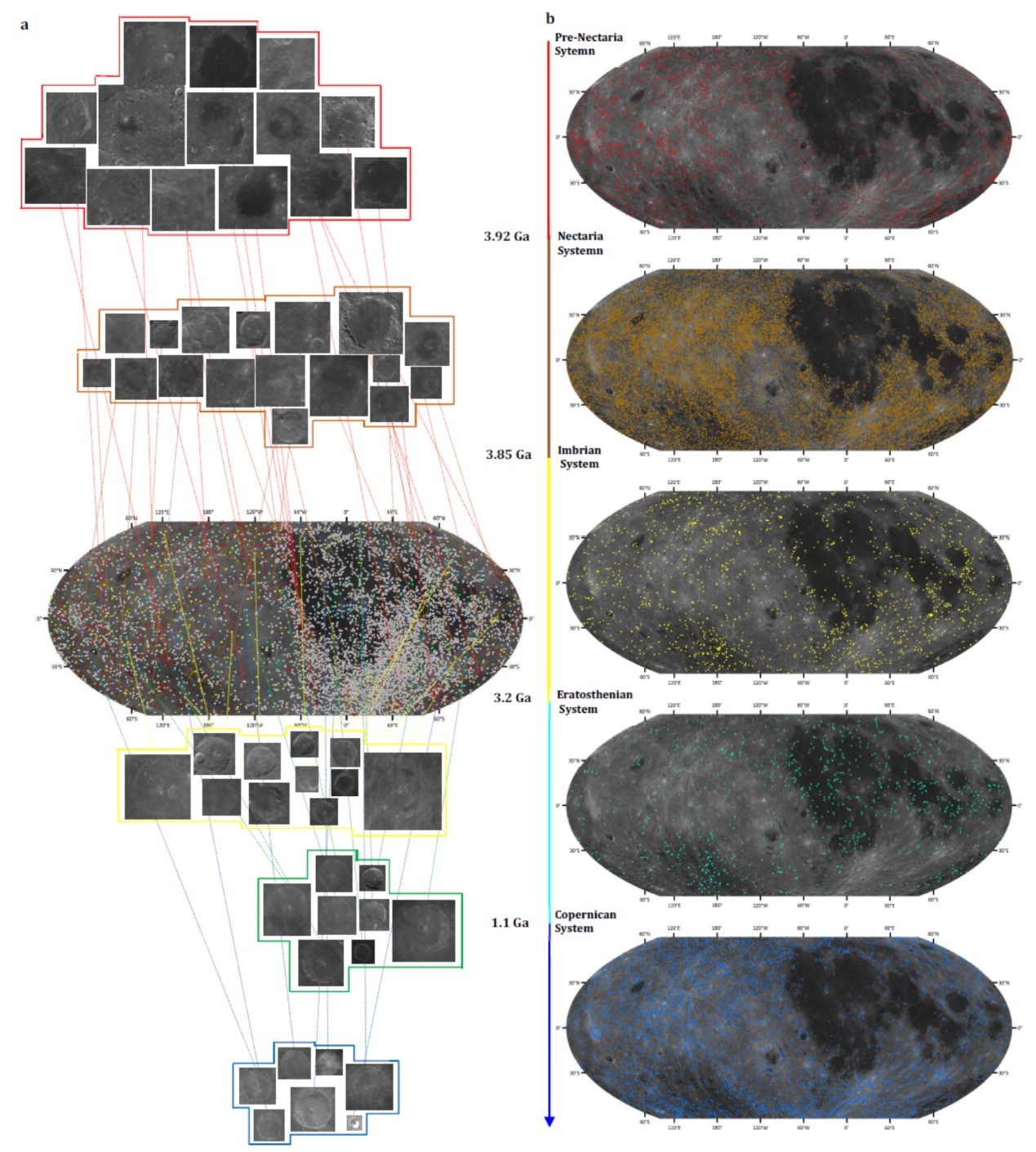 楊晨副教授等研究人員構(gòu)建了基于遷移學(xué)習(xí)的深度神經(jīng)網(wǎng)絡(luò)模型,從嫦娥一號(hào)(Chang'e 1)與嫦娥二號(hào)(Chang'e-2)數(shù)據(jù)中漸進(jìn)式的檢測撞擊坑并進(jìn)一步估計(jì)出其地質(zhì)年齡。109,956個(gè)新撞擊坑被識(shí)別,數(shù)量為公認(rèn)撞擊坑的十幾倍;18,996個(gè)(直徑大于8km)的撞擊坑被標(biāo)定了地質(zhì)年代。新撞擊坑與人工識(shí)別撞擊坑數(shù)據(jù)庫一致性高達(dá)85.30%,大型撞擊坑和小型撞擊坑假陽性分別為4.49%±0.7%和4.67%±2.1%。從空間分布與對(duì)比現(xiàn)有撞擊坑年代學(xué)方法證明了其年代標(biāo)定的可靠性和一致性。這些識(shí)別和標(biāo)定的撞擊坑貫穿于月球中緯度和低緯度地區(qū)。基于深度遷移學(xué)習(xí)的撞擊坑數(shù)據(jù)庫與模型對(duì)于月球及行星科學(xué)研究具有重要價(jià)值,得到了國內(nèi)外同行的認(rèn)可和高度評(píng)價(jià)。