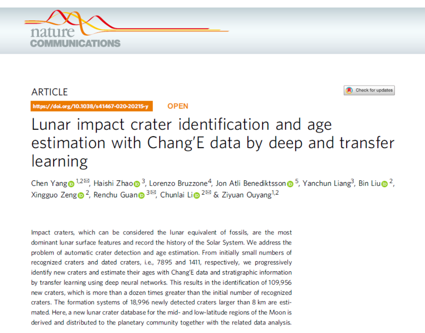 吉林大學(xué)地球科學(xué)學(xué)院楊晨副教授聯(lián)合吉林大學(xué)計(jì)算機(jī)科學(xué)與技術(shù)學(xué)院管仁初教授研究組、中國科學(xué)院國家天文臺(tái)月球與深空探測重點(diǎn)實(shí)驗(yàn)室歐陽自遠(yuǎn)院士團(tuán)隊(duì),在月球撞擊坑智能識(shí)別和年代標(biāo)定方面取得突破性進(jìn)展。研究成果以“Lunar impact craters identification and age estimation with Chang'E data by deep and transfer learning(DOI: 10.1038/s41467-020-20215-y)”為題,于2020年12月22日作為亮點(diǎn)文章發(fā)表于Nature子刊《Nature Communications》(文章鏈接:https://www.nature.com/articles/s41467-020-20215-y)。目前,研究成果被新華網(wǎng)、中國新聞網(wǎng)、NBC News、Popular Science、German Press Agency、Live Science、US News和CNN Digital等多家新聞媒體采訪和報(bào)道。