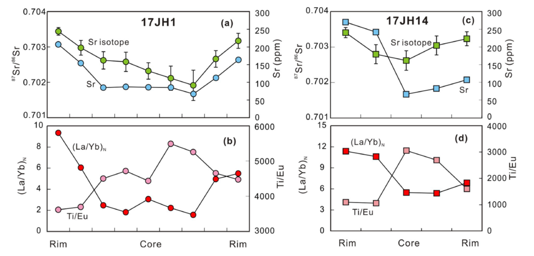 圖3. 二輝石巖(17JH1)和異剝橄欖巖(17JH14)中單斜輝石Sr同位素及微量元素組成的核邊變化