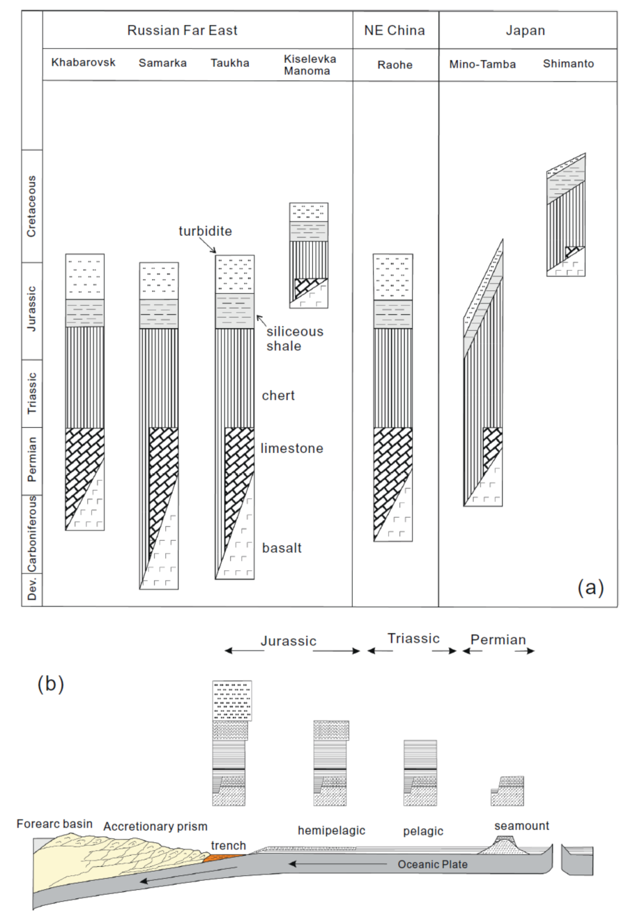 圖2 東北亞大陸邊緣中生代大洋板塊地層的重建(a)與形成過程(b)