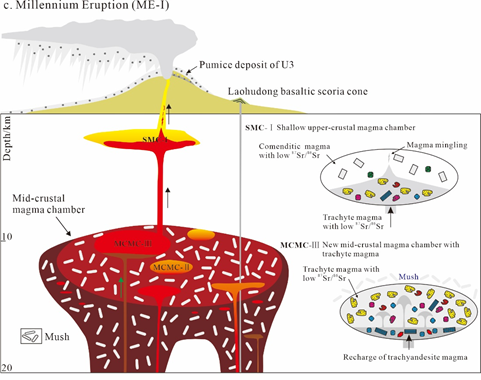 綜合以上研究,提出中地殼巖漿房中新生的粗面質(zhì)巖漿快速上升并突然注入淺部堿流質(zhì)巖漿房是千年大噴發(fā)最可能的觸發(fā)因素,并引起了千年大噴發(fā)第一期和千年大噴發(fā)第二期兩次噴發(fā)時間相近,噴發(fā)物巖石學(xué)、礦物學(xué)和地球化學(xué)屬性具有較大差異的火山噴發(fā)作用(圖3)。