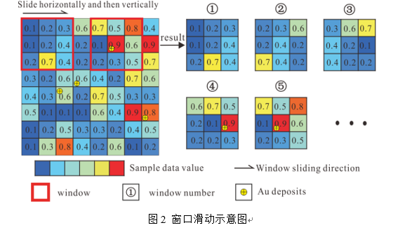 通過窗口滑動進行數(shù)據(jù)增強獲取樣本數(shù)據(jù)(圖2),并采用卷積神經(jīng)網(wǎng)絡(CNN)提取窗口的數(shù)據(jù)特征,每個窗口的網(wǎng)格數(shù)據(jù)可看成一幅包括地質(zhì)、化探、物探信息的多通道圖像,再通過樣本隨機配對方式構建訓練和驗證樣本數(shù)據(jù)集,進一步增強數(shù)據(jù)集。
