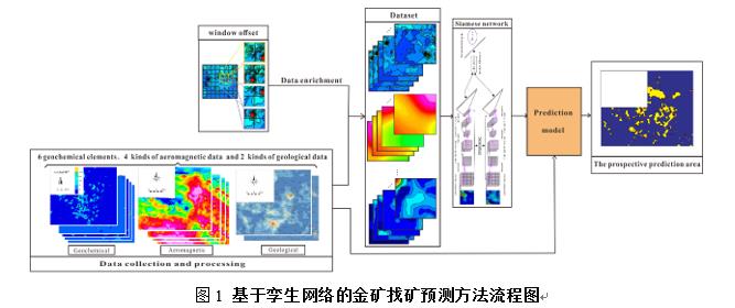 孿生網(wǎng)絡是一種基于度量的元學習網(wǎng)絡,元學習可以學會學習:即用過去的知識和經(jīng)驗來指導新任務的學習。與常規(guī)神經(jīng)網(wǎng)絡的不同是:孿生網(wǎng)絡輸入的是一對樣本,能夠通過衡量輸入樣本的相似性從新樣本中自動發(fā)現(xiàn)泛化特征。該網(wǎng)絡應用于礦產(chǎn)勘察領域進行找礦的主要步驟(圖1)如下: