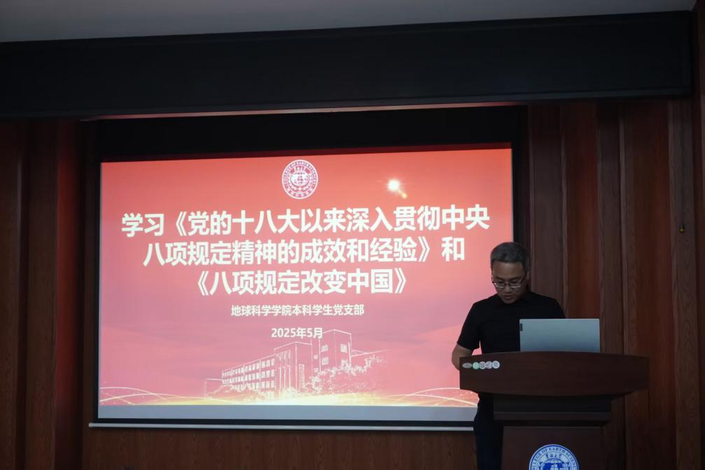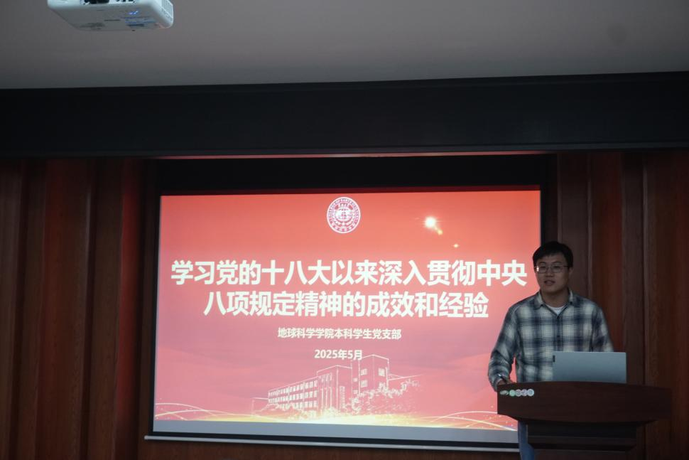 為扎實(shí)推進(jìn)深入貫徹中央八項(xiàng)規(guī)定精神學(xué)習(xí)教育,地球科學(xué)學(xué)院本科學(xué)生黨支部于5月29日晚19:00在鴿子樓一樓報告廳召開主題黨日活動。活動由本科學(xué)生第一黨支部書記趙晶老師主持,學(xué)院黨委副書記兼副院長李陽老師、主管本科教學(xué)副院長錢燁老師、本科學(xué)生第二黨支部書記宋梓豪老師出席會議,全體學(xué)生黨員參加活動。