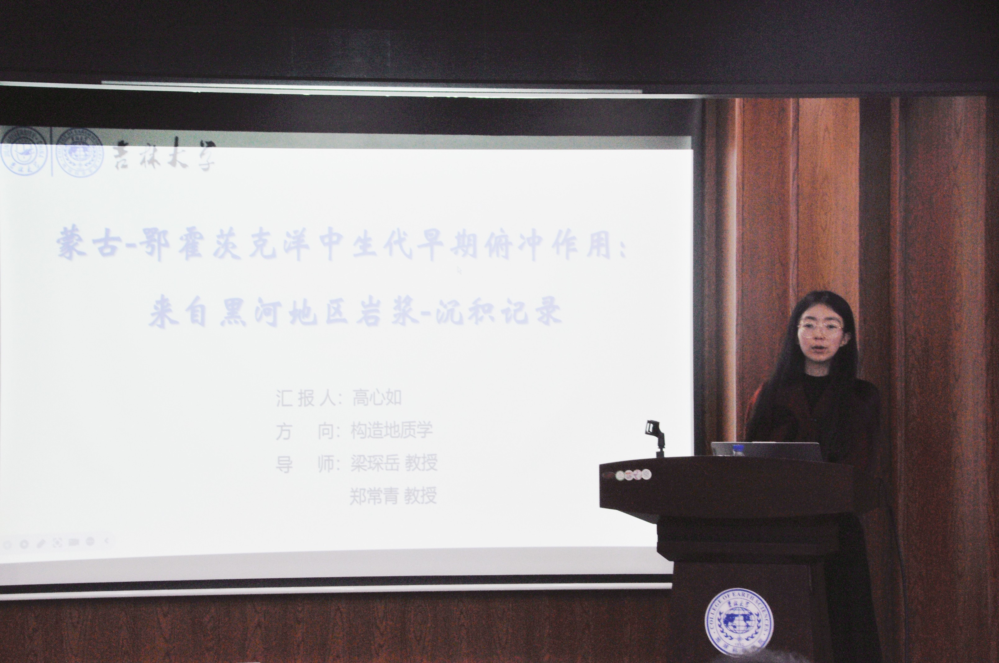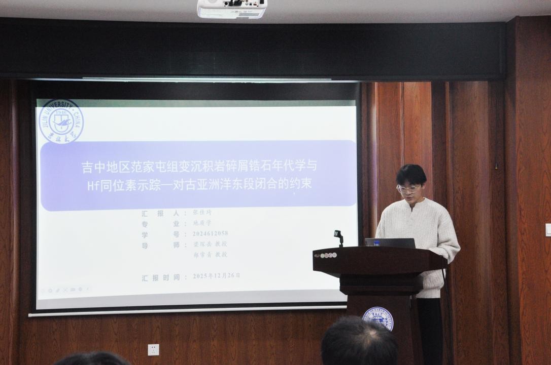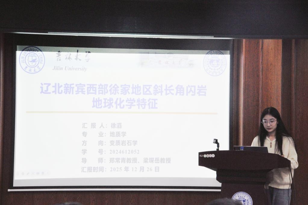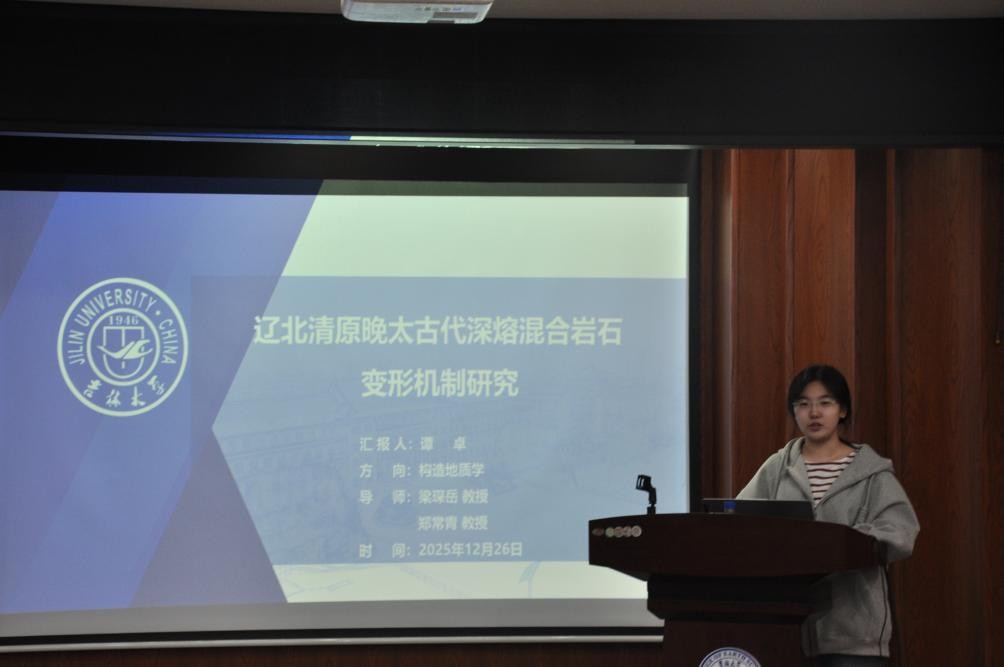 活動上,譚卓同學(xué)聚焦遼北清原晚太古代深熔混合巖變形機(jī)制展開研究闡述;孫路華同學(xué)深入分析遼西醫(yī)巫閭山同構(gòu)造花崗質(zhì)巖石變形特征及成因;張佳琦同學(xué)通過吉中地區(qū)范家屯組變沉積巖碎屑鋯石年代學(xué)與Hf同位素示蹤,為古亞洲洋東段閉合提供約束依據(jù);徐滔同學(xué)詳解遼北新賓西部徐家地區(qū)斜長角閃巖地球化學(xué)特征;高心如同學(xué)結(jié)合巖漿-沉積記錄,探討蒙古-鄂霍茨克洋中生代早期俯沖作用;劉建寧同學(xué)研究鞍山—本溪地區(qū)~2.1Ga變基性侵入巖的巖石成因及其構(gòu)造意義;黃宇奇同學(xué)基于松遼盆地上白堊統(tǒng)嫩江組化石,開展無尾兩棲類演化研究;吳澈同學(xué)圍繞遼東桃源金礦礦床地質(zhì)特征及成因展開系統(tǒng)匯報。