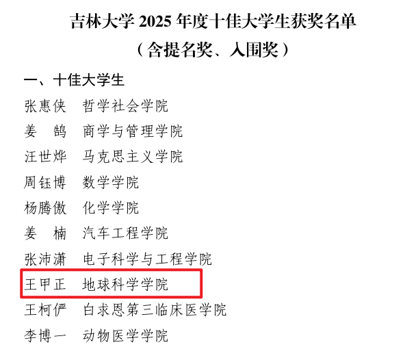 2022級本科生王甲正連續(xù)三年專業(yè)第一,58門課程滿績,斬獲全國大學(xué)生不動產(chǎn)估價大賽國家一等獎等榮譽40余項,發(fā)表高水平論文,累計擔(dān)任17項學(xué)生干部職務(wù),志愿服務(wù)超2200小時,以實際行動踐行守土興邦的地學(xué)使命,獲評“十佳大學(xué)生”榮譽稱號。