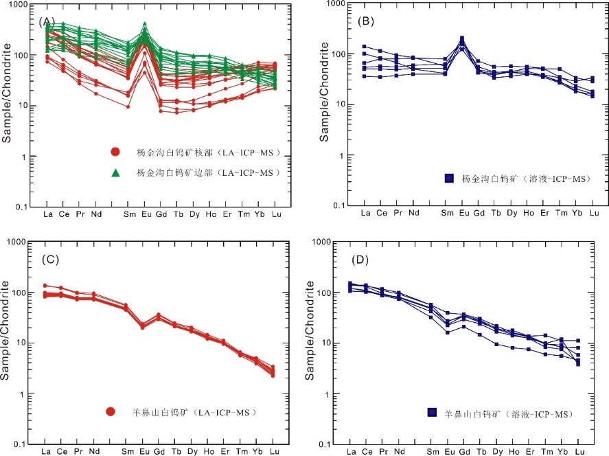圖1 楊金溝、羊鼻山礦區(qū)白鎢礦稀土元素球粒隕石標(biāo)準(zhǔn)化配分型式圖