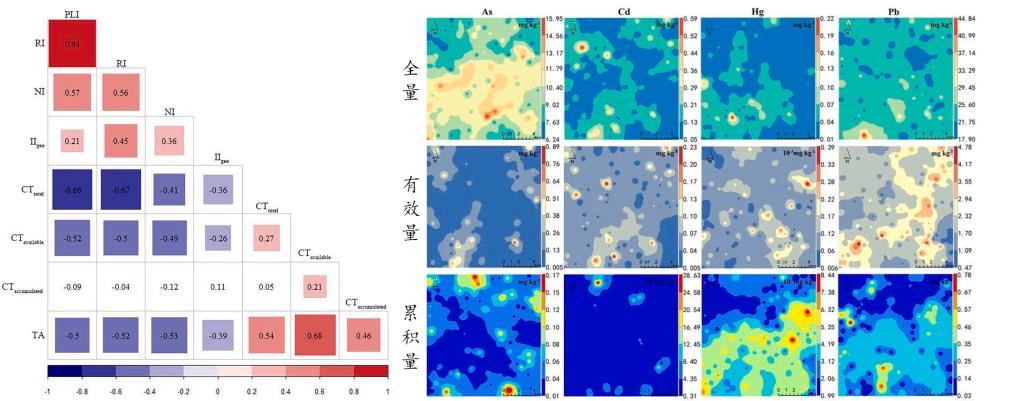圖1土壤重金屬全量、有效量和作物富集量空間分布與評(píng)價(jià)結(jié)果Pearson相關(guān)性檢驗(yàn)