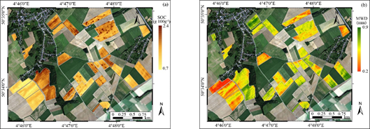 (2)從近地傳感到航空高光譜遙感,利用Airborne Prism Experiment(APEX)高光譜影像,完成了比利時黃土帶區(qū)域尺度高空間分辨率的團聚體穩(wěn)定性空間表征,生成的分布圖可有效捕捉多尺度的土壤有機碳含量和土壤退化空間變異(圖2)。