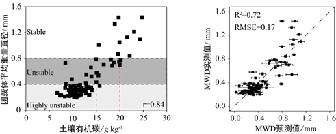 圖1(a)土壤有機碳與團聚體穩(wěn)定性相關(guān)關(guān)系圖和(b)基于可見-近紅外光譜的團聚體穩(wěn)定性預(yù)測模型精度評估