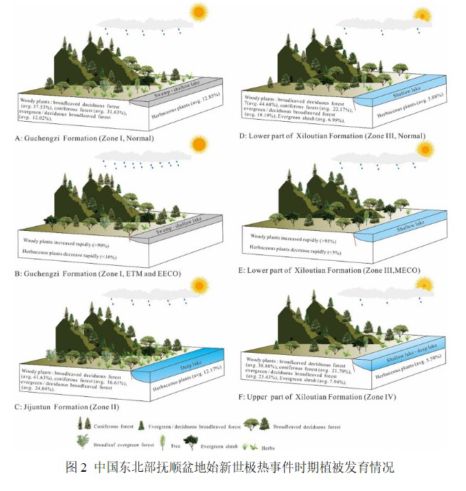 在古城子火山灰絕對(duì)年齡、生物和古地磁年齡基礎(chǔ)上,開(kāi)展了米氏旋回分析,建立了天文年代標(biāo)尺,并結(jié)合CIE,在撫順盆地始新統(tǒng)識(shí)別出ETM2、ETM3、EECO等極熱事件,同時(shí)結(jié)合磁化率和色度與同位素的變化趨勢(shì)、聚類(lèi)分析,確定磁化率是進(jìn)行古氣候分析的有效指標(biāo)。根據(jù)孢粉組合特征,確定東北地區(qū)始新統(tǒng)極熱時(shí)期古氣溫上升2-5℃,降雨量增加了200-600mm,同時(shí)高溫事件促使針葉樹(shù)等木本植物的生長(zhǎng),促進(jìn)了碳封存,揭示出始新世氣候變暖的短期爆發(fā)導(dǎo)致亞洲中緯度地區(qū)植被發(fā)生重大變化,改變了景觀,并改變了區(qū)域水文狀況(圖2)。