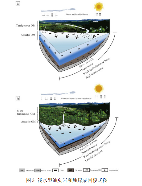 根據(jù)我國(guó)陸相盆地油頁(yè)巖賦存特征,識(shí)別出深水和淺水兩種類(lèi)型的油頁(yè)巖礦床,并以撫順盆地西露天組和大長(zhǎng)溝盆地八道灣組淺水油頁(yè)巖為實(shí)例開(kāi)展有機(jī)質(zhì)富集機(jī)制研究,總體表明水陸生態(tài)變化及有機(jī)質(zhì)來(lái)源的更替(圖3)、淺水蒸發(fā)咸化是控制淺水型油頁(yè)巖發(fā)育厚度、品質(zhì)和展布特征的關(guān)鍵因素。