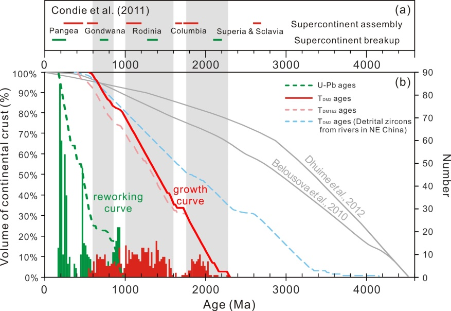 地球區(qū)別于其他類地行星的重要標(biāo)志是其具有演化所形成的長英質(zhì)大陸地殼。大陸地殼形成的機制和速率等一直是地球科學(xué)領(lǐng)域研究的前沿與核心問題。超大陸的旋回歷史與大陸地殼的生長與演化過程密切相關(guān),這也被地球歷史上周期性分布的地質(zhì)記錄所證實,包括花崗巖和碎屑鋯石的結(jié)晶年齡、地幔柱、大火山巖省和綠巖帶的形成年齡等等。然而,目前關(guān)于全球大陸地殼生長模式的主流觀點是,現(xiàn)今大陸地殼的主體是在 ~ 2.5Ga之前就已形成,并且具有漸進(jìn)式生長的特點,這與地球歷史上幕式分布的巖石組合和地質(zhì)事件形成了鮮明對比。這種現(xiàn)象的產(chǎn)生可能是由于前人的研究大多聚焦于克拉通地區(qū),而對造山帶陸殼增生方式及造山帶內(nèi)不同構(gòu)造單元陸殼演化的研究卻涉及較少。