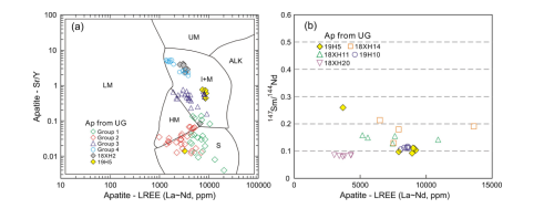 圖5 未經(jīng)晚期構(gòu)造熱事件改造的花崗巖中磷灰石的微量元素和Nd同位素組成。(a)源巖類型判別圖(O’Sullivan et al., 2020);(b)147Sm/144Nd比值隨LREE含量的變化