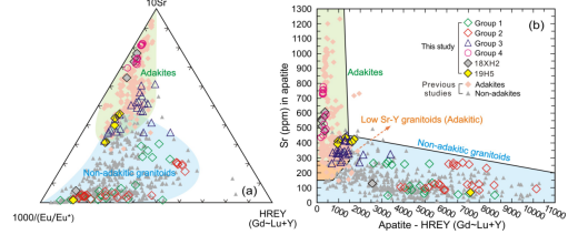 圖6 磷灰石地球化學(xué)組成判別埃達(dá)克巖圖解(Sun et al., 2021)