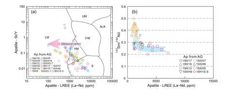圖2 經(jīng)歷晚期構(gòu)造熱事件改造的花崗巖中磷灰石的微量元素和Nd同位素組成。(a)源巖類型判別圖(O’Sullivan et al., 2020);(b)147Sm/144Nd比值隨LREE含量的變化