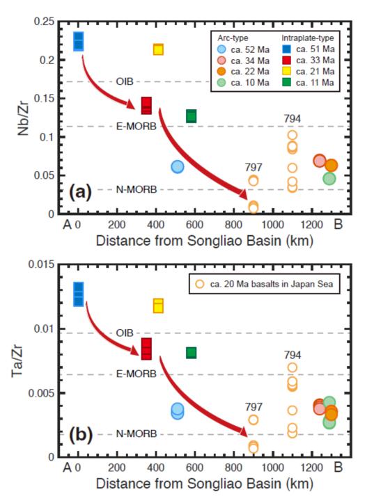 圖3. 東北亞陸緣新生代玄武巖的Nb/Zr和 Ta/Zr比值與松遼盆地的距離