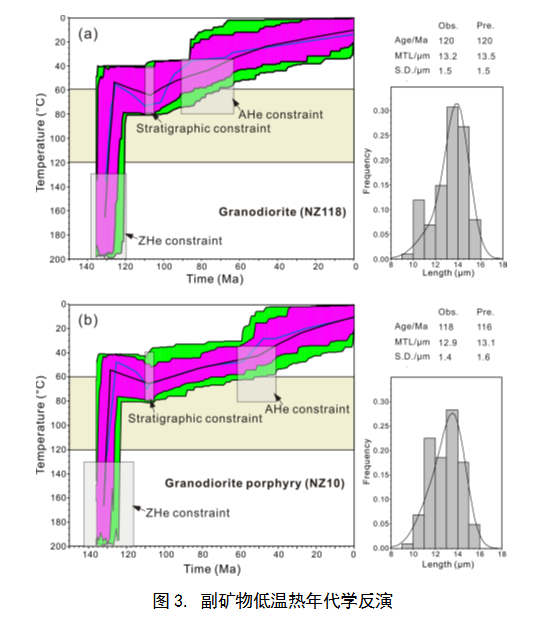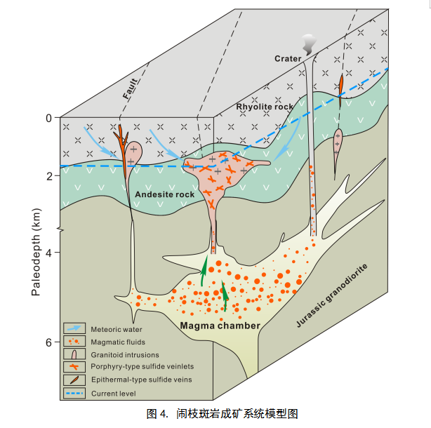 3. 巖體內(nèi)副礦物—鋯石和磷灰石低溫?zé)崮甏鷮W(xué)結(jié)果被用于反演巖體就位后時間-溫度歷史;Hefty軟件模擬結(jié)果表明巖體就位后保存溫度低于60℃,就位深度小于2km(與流體壓力計(1.7 km)結(jié)果吻合);在110 Ma左右經(jīng)歷了溫度升高(108 Ma火山作用有關(guān);該期火山覆蓋為礦床的保存提供了關(guān)鍵的保障),而后逐漸遭受地殼抬升與風(fēng)化剝蝕出露地表(圖3)。因此,該成礦系統(tǒng)古深度小于2 km,在其深部具有優(yōu)越的尋找斑巖型Cu-(Mo-Au)礦床的潛力(圖4) 。