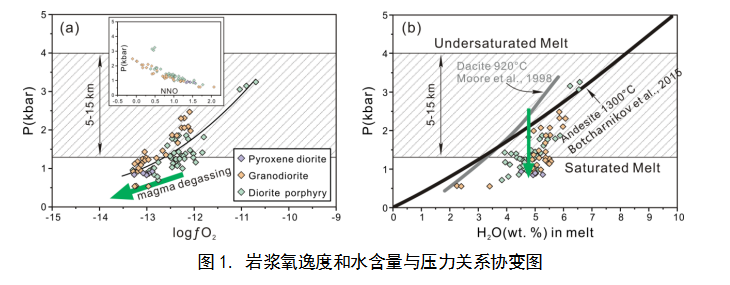 1. 依據(jù)角閃石地球化學(xué)組成獲取的巖漿物理化學(xué)屬性表明鬧枝成礦系統(tǒng)中巖漿為中等氧化、富水巖漿;相對于深部地殼,巖漿在淺部地殼經(jīng)歷了長時間的存儲和演化過程,而且?guī)r漿脫氣和流體出溶作用使巖漿氧逸度和含水量發(fā)生明顯降低(圖1)。