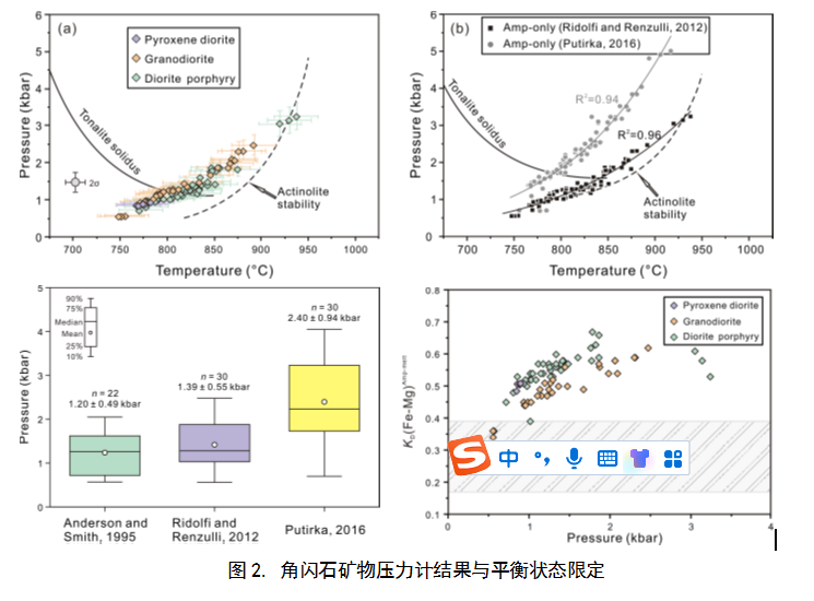 2. 角閃石礦物普遍出現(xiàn)于中–酸性侵入巖內(nèi),在巖漿冷凝結(jié)晶過程中礦物生長與熔體保持物理化學(xué)態(tài)平衡,因此依據(jù)該礦物成分角閃石結(jié)晶壓力條件為3.25 ± 0.37 kbar 至0.56 ± 0.06 kbar(圖1),橫跨中-上地殼層位。在礦物形態(tài)學(xué)研究基礎(chǔ)上,KD(Fe-Mg)mineral-melt系數(shù)被用于約束是否角閃石與共生熔體達(dá)到平衡;結(jié)果表明僅個別低壓角閃石處于平衡狀態(tài)下,對應(yīng)的壓力范圍為0.56~0.57 kbar(圖2),指示巖體最終就位深度為<2.1 km。