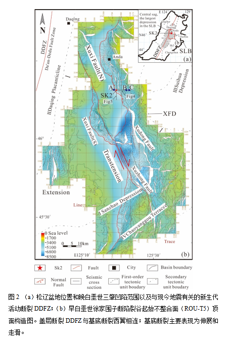 松遼盆地面積26萬km2,地處我國東北。它不僅是東北亞地區(qū)規(guī)模最大、油氣最富集的盆地,同時也是全球白堊紀(jì)地層記錄最齊全的巨型沉積盆地。它被譽(yù)為是新中國油氣工業(yè)的搖籃,在世界石油地質(zhì)研究中占據(jù)獨(dú)特的重要地位。松遼盆地油氣地質(zhì)研究已經(jīng)取得了舉世矚目的成就,成為過去60多年該盆地中淺層油氣勘探開發(fā)的理論支撐。然而,由于埋深大、難以獲取有力的直接地質(zhì)記錄,因此大大增加了埋深五千米以下的深層/超深層盆地屬性的探索難度;這使得人們對松遼盆地初始裂陷的形成過程迄今還缺乏必要的認(rèn)知(圖1)。