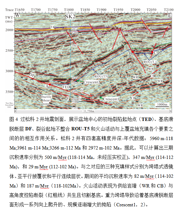 3. 初始裂陷成因?qū)ι顚佑蜌饪碧降闹匾笇?dǎo)意義:本文首次厘米級精細(xì)刻畫了松科2井鉆穿的深層主要地質(zhì)界面,包括裂開不整合(breakup unconformity, BU-T4)、裂谷起始不整合(rift onset unconformity, ROU-T5)、基底滑脫斷層(basement detachment fault, DF)和三疊系-古生界基底序列內(nèi)部不整合面(T6);指出了它們的成因和分布規(guī)律(圖4)。這些界面的埋深通常超過五千米,是目前深層油氣勘探的主力層系。基于科探井上述新發(fā)現(xiàn)重新建立了盆地深層的地質(zhì)屬性-地震響應(yīng)關(guān)系,為超深層油氣目標(biāo)刻畫提供了重要理論依據(jù)。