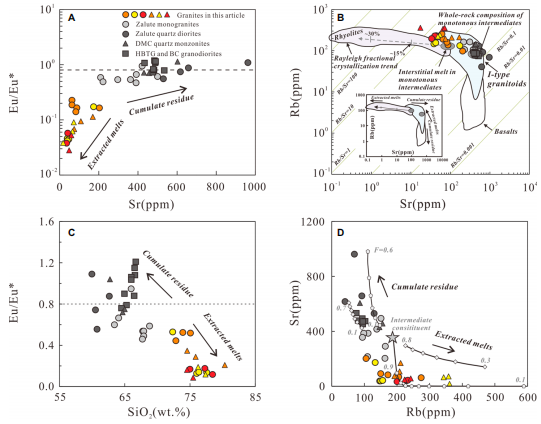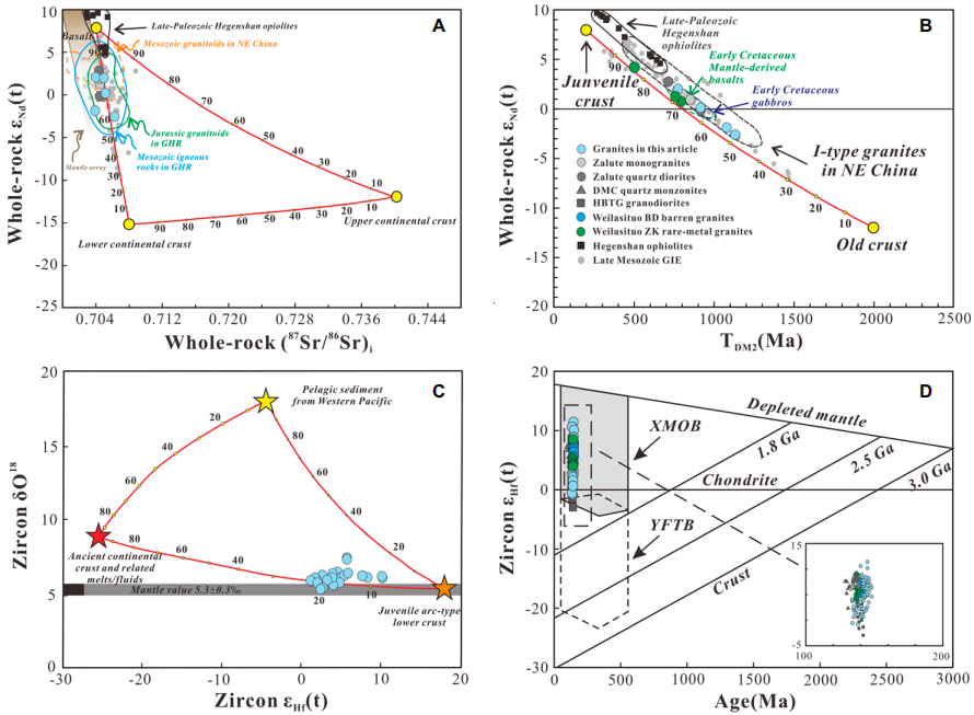 1. 確定了高分異花崗巖的源區(qū)組成。高分異花崗巖屬于高分異I型花崗巖,主要造巖礦物和副礦物共同的分離結(jié)晶在其形成過程中起到了至關(guān)重要的作用。鋯石O-Hf和全巖Sr-Nd-Hf同位素組成指示早白堊世高分異花崗巖起源于年輕弧型下地殼與古老陸殼基底的重熔,并可能存在再循環(huán)遠(yuǎn)洋沉積物的貢獻(xiàn)(圖2)。