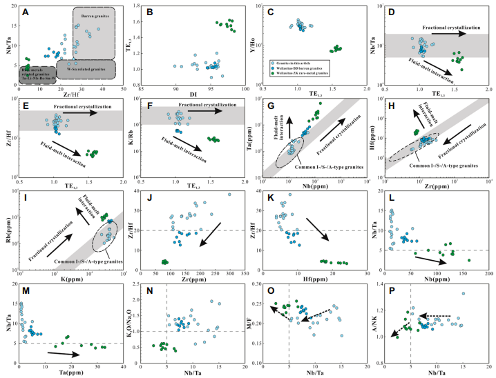 3. 探討了控制高分異花崗巖稀有金屬礦化的機(jī)制。與研究區(qū)花崗巖相比,維拉斯托稀有金屬花崗巖具有更高的DI以及更低的雙胞胎元素比值(Zr/Hf、Nb/Ta、Y/Ho、K/Rb),進(jìn)一步證明強(qiáng)烈的高度分異作用是控制大興安嶺南段稀有金屬成礦的關(guān)鍵因素(圖5)。而雙胞胎元素比值和TE1,3值之間的負(fù)相關(guān)性指示維拉斯托稀有金屬花崗巖相比于貧礦高分異花崗巖經(jīng)歷了強(qiáng)烈的熔流體相互作用(圖5)。因此,I型花崗質(zhì)巖漿稀有金屬礦化可能是高分異程度和強(qiáng)熔流體相互作用相耦合的結(jié)果。