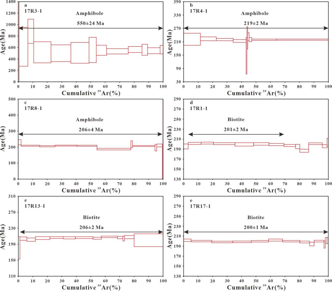 1. 對(duì)布列亞地塊~935 Ma角閃巖開(kāi)展了角閃石40Ar/39Ar年代學(xué)研究,獲得了550 ± 24 Ma的40Ar/39Ar坪年齡(圖1a),首次確證了布列亞地塊也經(jīng)歷了晚泛非期變質(zhì)作用,進(jìn)一步從變質(zhì)時(shí)代角度證實(shí)了布列亞地塊和佳木斯-興凱地塊屬于同一個(gè)微陸塊。