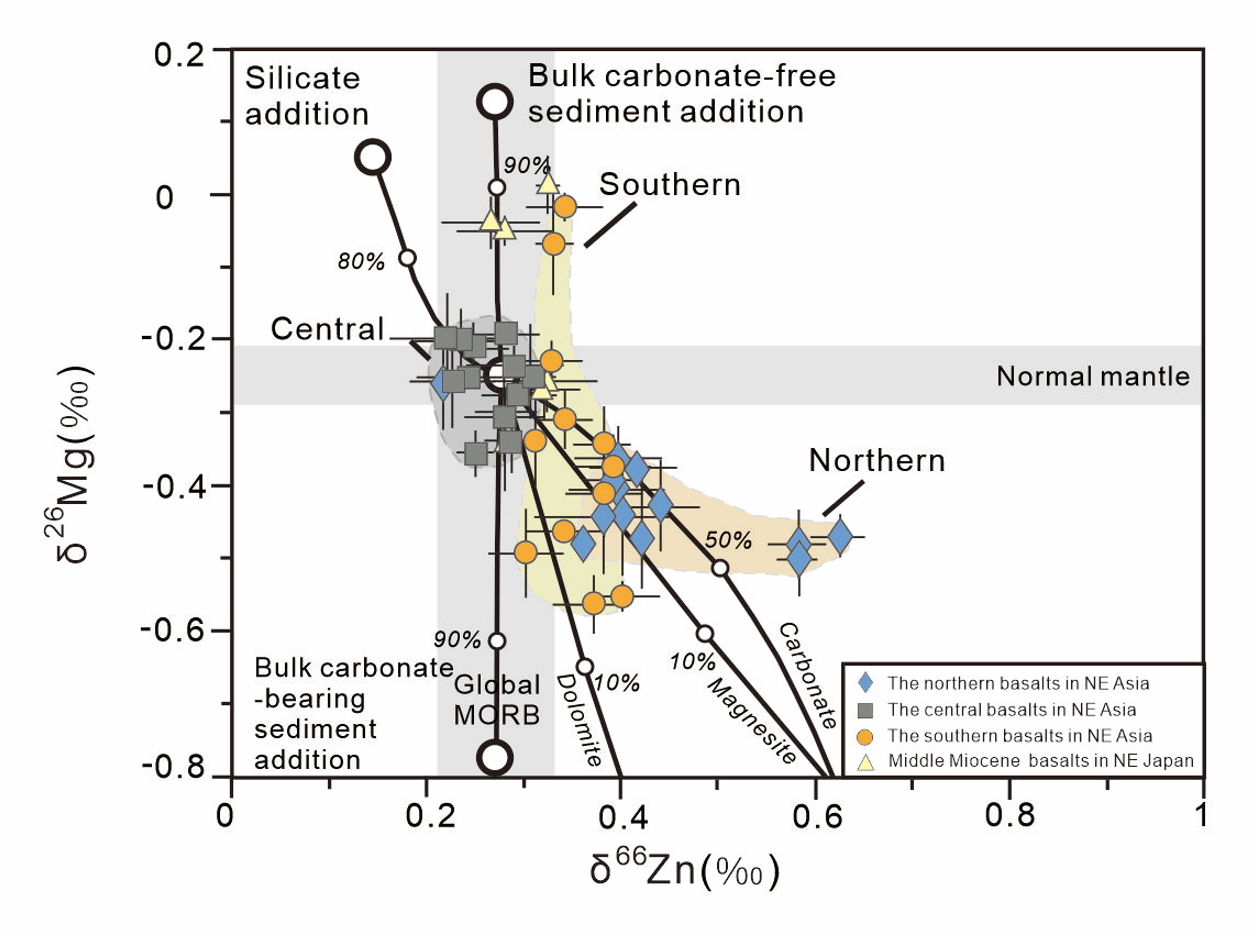 針對這一關(guān)鍵問題,我院許文良教授引領(lǐng)的“吉林大學(xué)地球深部動力學(xué)創(chuàng)新團隊”聯(lián)合中國地質(zhì)大學(xué)(北京)劉盛遨教授,對東北亞陸緣、平行于俯沖帶分布的中新世板內(nèi)玄武巖開展了系統(tǒng)的Mg-Zn同位素研究(圖1),結(jié)合東北亞陸緣新生代玄武巖中地幔捕虜體的空間分布和地球物理觀測資料,為單一俯沖帶小尺度碳輸入的三維空間變異提供了關(guān)鍵證據(jù)。具體研究成果如下: