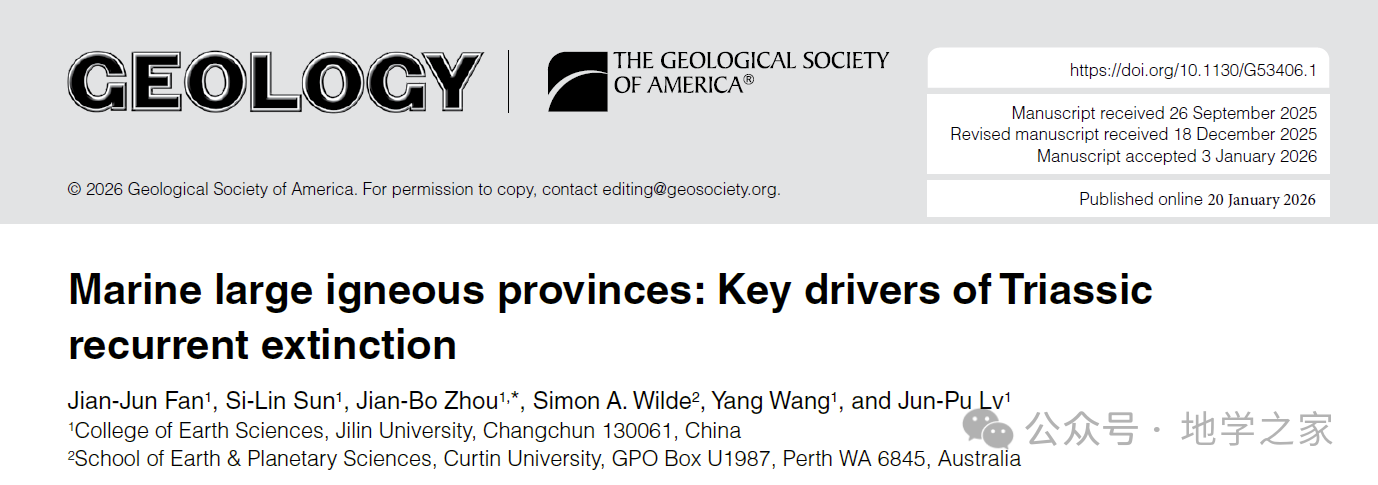 論文鏈接:Jian-Jun Fan(范建軍), Si-Lin Sun(孫思霖), Jian-Bo Zhou?(周建波), Simon A. Wilde, Yang Wang(王洋), and Jun-Pu Lv(呂峻浦). Marine large igneous provinces: Key drivers of Triassic recurrent extinction. Geology, (2026), online,https://doi.org/10 .1130/G53406.1