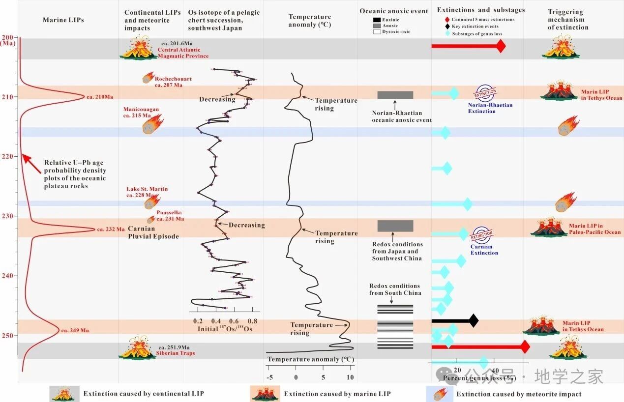 圖3 三疊紀(jì)海相大火成巖省、大陸大火成巖省、隕石撞擊事件與生物滅絕