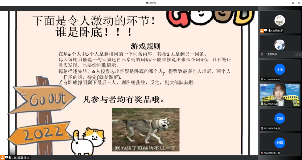 在介紹的環(huán)節(jié)中穿插的小游戲“誰(shuí)是臥底”將氣氛再次點(diǎn)燃,同學(xué)們積極報(bào)名,“西瓜”與“哈密瓜”的角逐激烈而迅速,參與的同學(xué)也都各有收獲。
