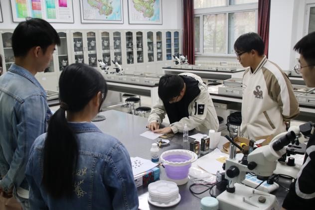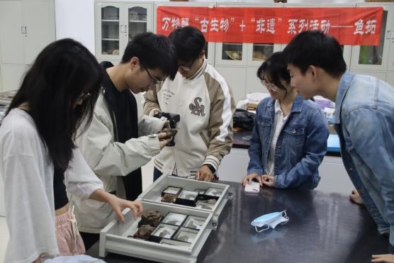活動(dòng)開(kāi)始,外院同學(xué)對(duì)實(shí)驗(yàn)室陳列的化石標(biāo)本表現(xiàn)出極大興趣與熱情,代金韜結(jié)合教學(xué)化石,講解了古生物、化石、化石的類型等古生物基礎(chǔ)知識(shí),并解答外院同學(xué)的問(wèn)題。