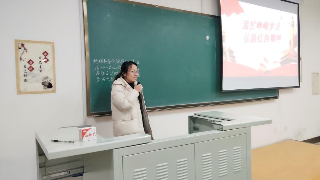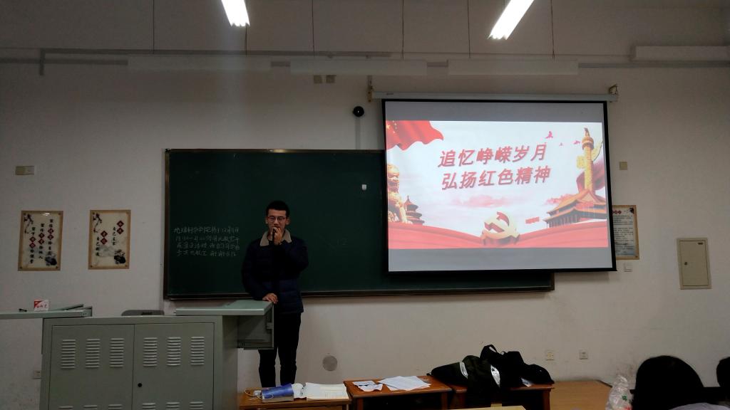 為了推進愛國主義教育,提高同學(xué)們的社會責(zé)任感和歷史使命感,讓同學(xué)們更好地了解歷史,從而緬懷先烈,致敬先烈,懷揣夢想,堅定理想信念并為之不懈努力追求,2018年12月11日晚6點地球科學(xué)學(xué)院18級三班全體同學(xué)于李四光樓309教室參加了以“追憶崢嶸歲月,弘揚紅色精神”為主題的觀影活動。本次活動由三班團支書主持,得到了同學(xué)們的熱烈反響。活動中同學(xué)們都積極配合,熱情高漲,使得本次活動圓滿結(jié)束。
