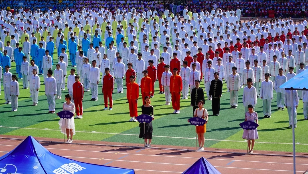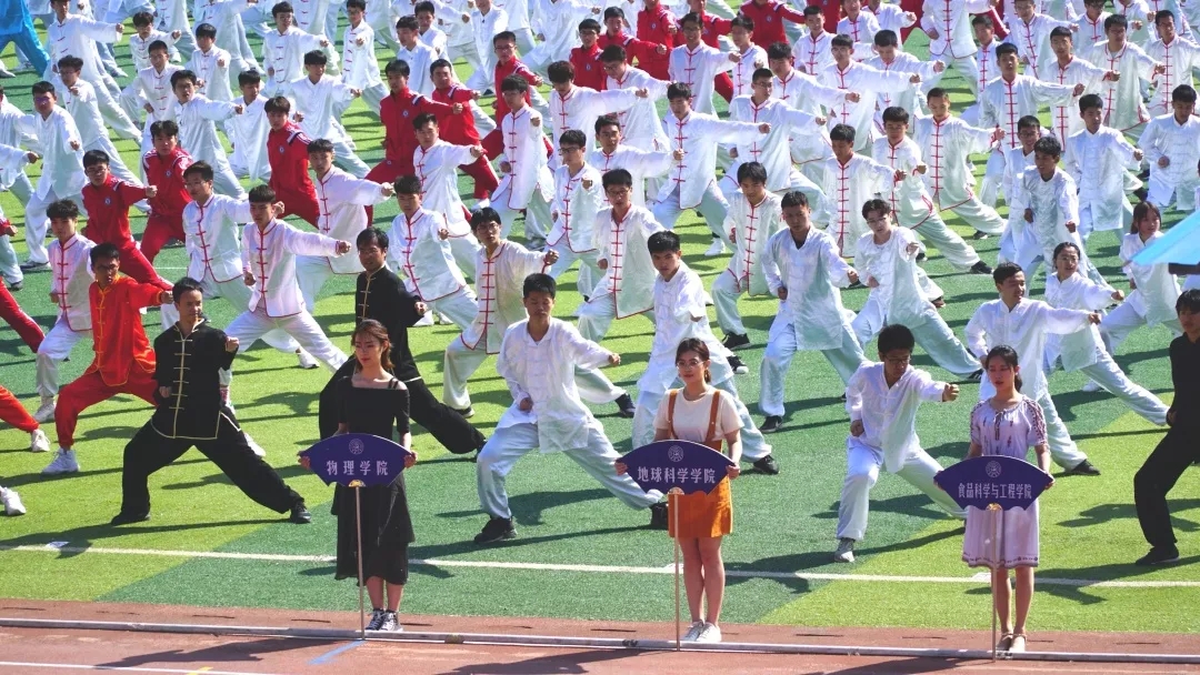 首位出場的是萬眾期待已久的“三路長拳”表演者!進場之后,聽從領(lǐng)導(dǎo)的指揮,行抱拳禮,蓄勢待發(fā)!音樂響起,一排排昂首挺胸的“小白人”隨著音樂起勢,跟著節(jié)奏,循著指令打出動作,一招一式都充滿力量!沒錯,最整齊的那一組同學就是我們地球科學學院的學生。近距離觀察,每個人都精神飽滿,拉長鏡頭,動作不徐不緩,每一拳一腿都充滿力量,整齊劃一,令在座的觀眾不禁拍手稱好!快樂的時光總是那么短暫,仿佛一眨眼間,“小白人”再次行了抱拳禮,“三路長拳”表演到此結(jié)束!