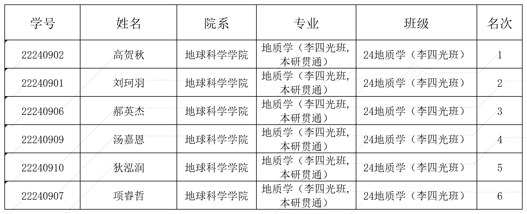 按照“公平、公開”的原則,經(jīng)2024級地質(zhì)學(xué)(李四光班)同學(xué)報(bào)名,各位評委老師進(jìn)行面試,現(xiàn)對英國曼徹斯特大學(xué) 2025 年短期學(xué)術(shù)交流選拔名單排名進(jìn)行公示: