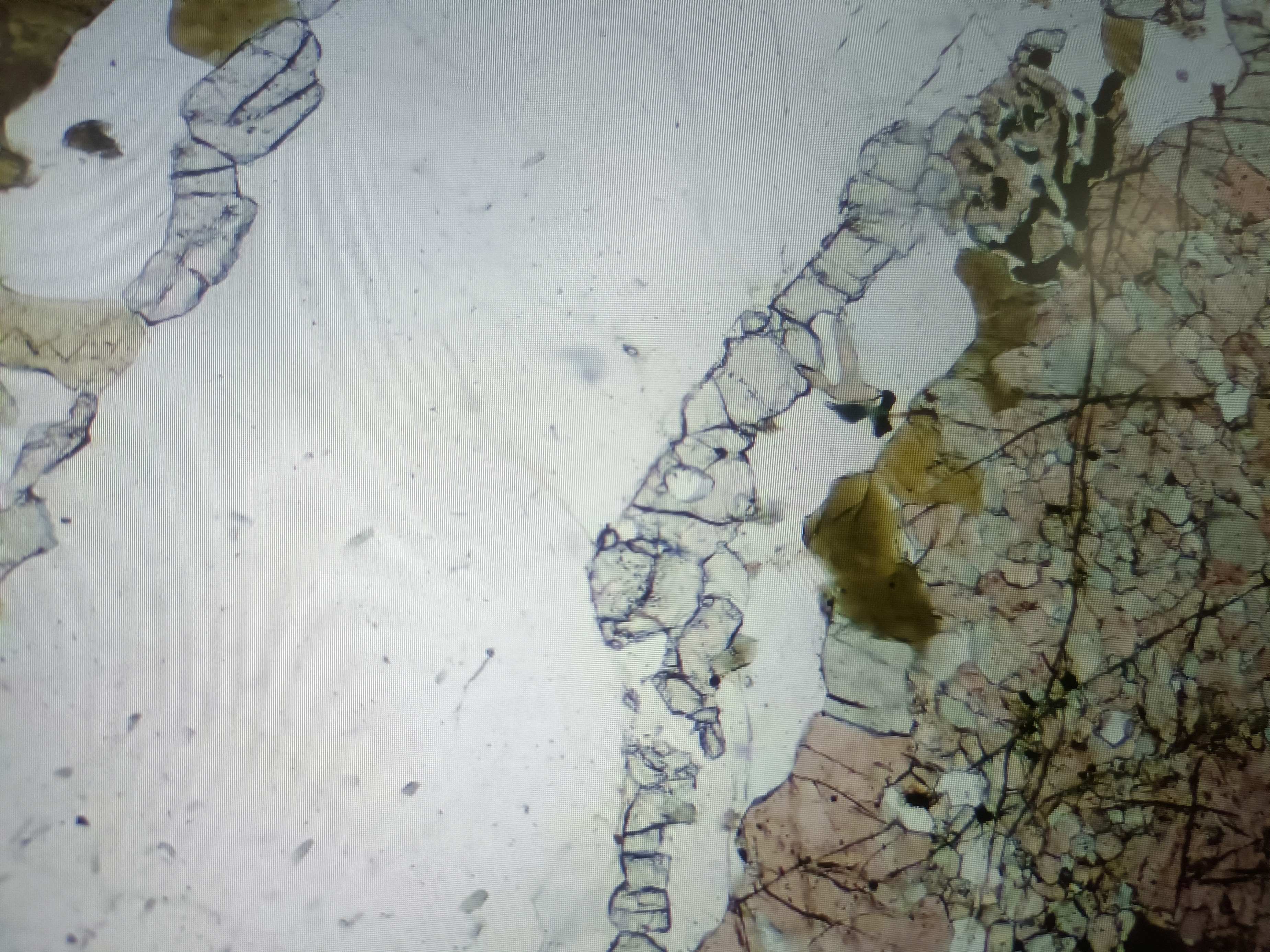 這細長的石榴石帶,是中高壓變質作用的產物,紫蘇輝石與斜長石的反應,構架了這一條長帶。我們地質工作者要經受得住高壓,不"變質",更不要"變心",祖國需要我們,人民也需要我們,踏遍山河萬里,壯我國地質雄威。